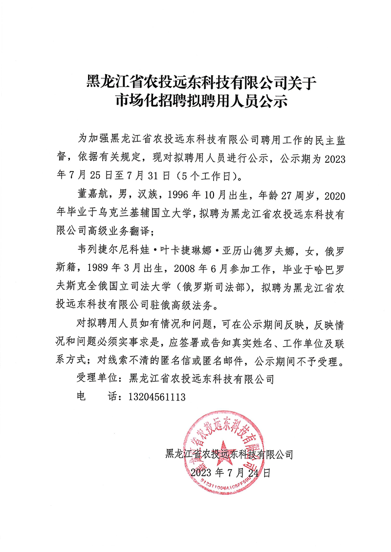 黑龙江省农投远东科技有限公司关于市场化招聘拟聘用人员公示
