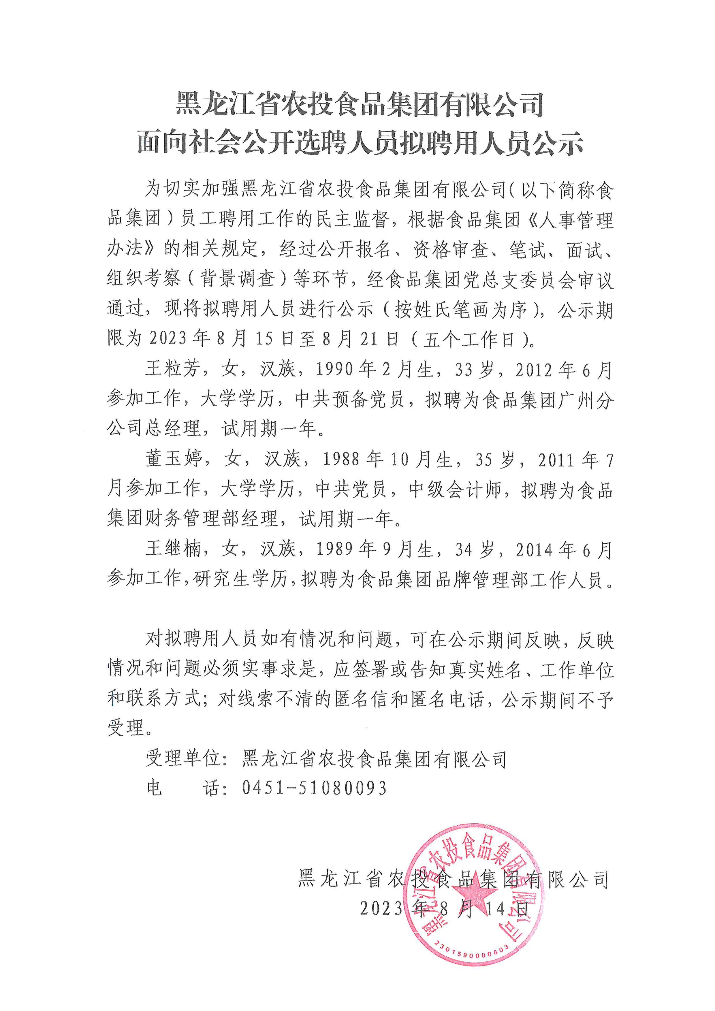 黑龙江省农投食品集团有限公司面向社会公开选聘人员拟聘用人员公示