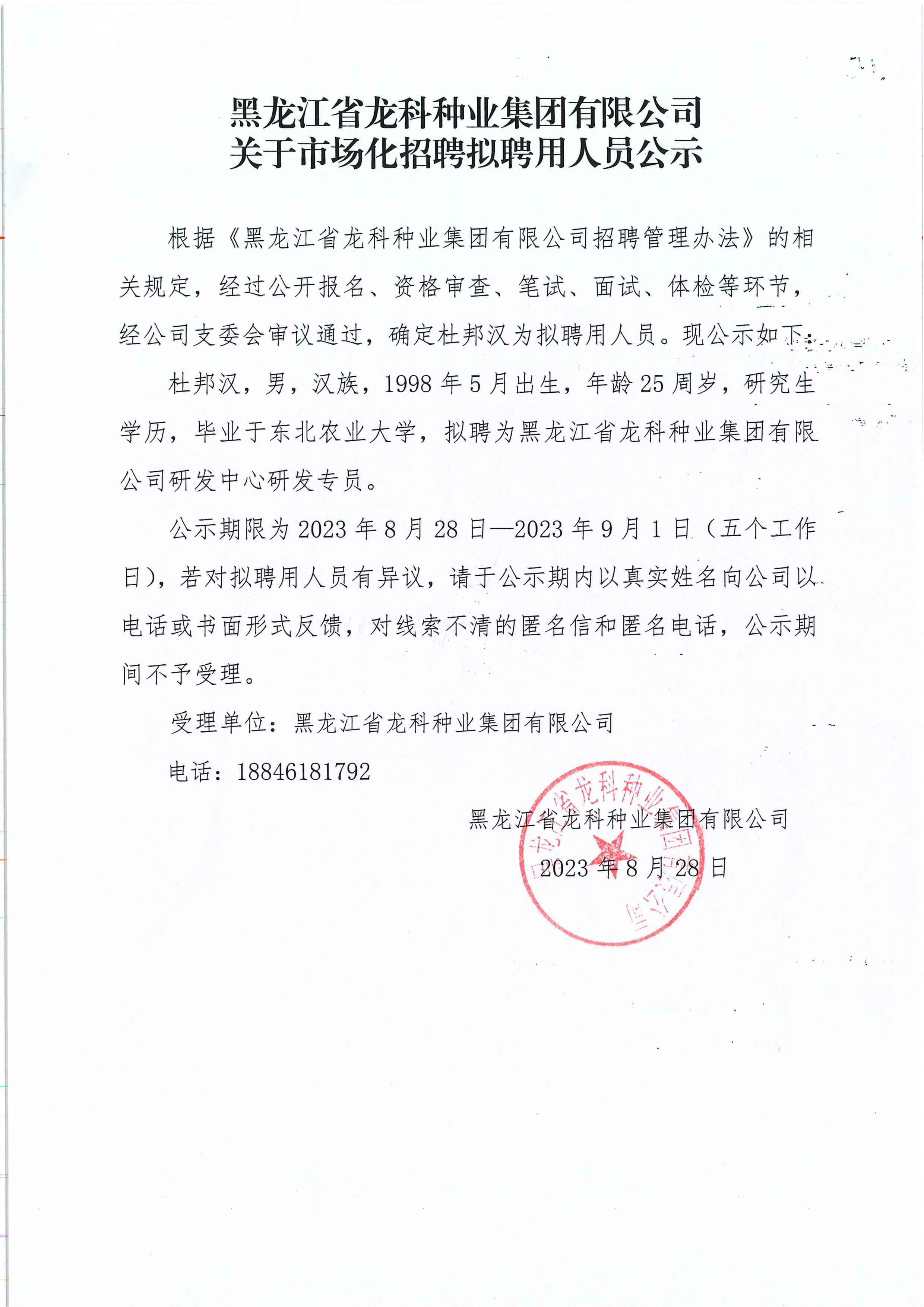 黑龙江省龙科种业集团有限公司关于市场化招聘拟聘用人员公示