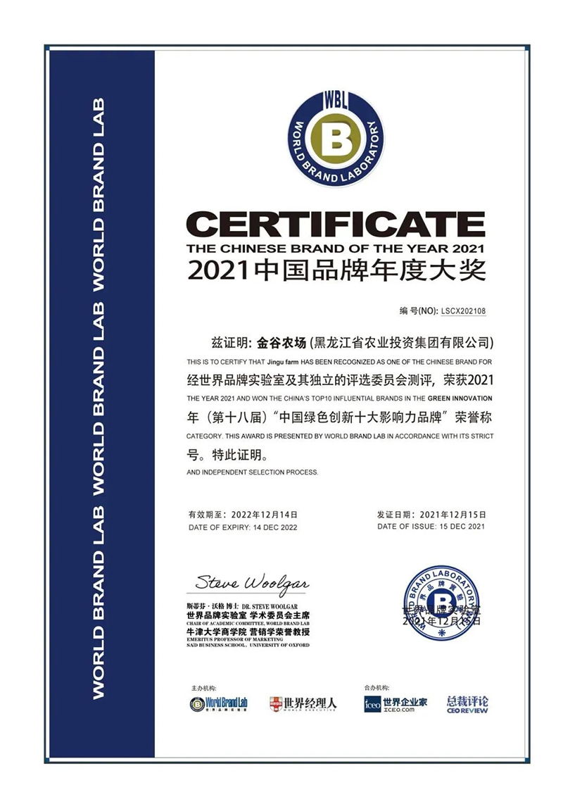 2021年12月15日,2021年“中国品牌年度大奖”评选揭晓,农投集团旗下“金谷农场”品牌在此次评选中荣获“中国绿色创新十大影响力品牌”。