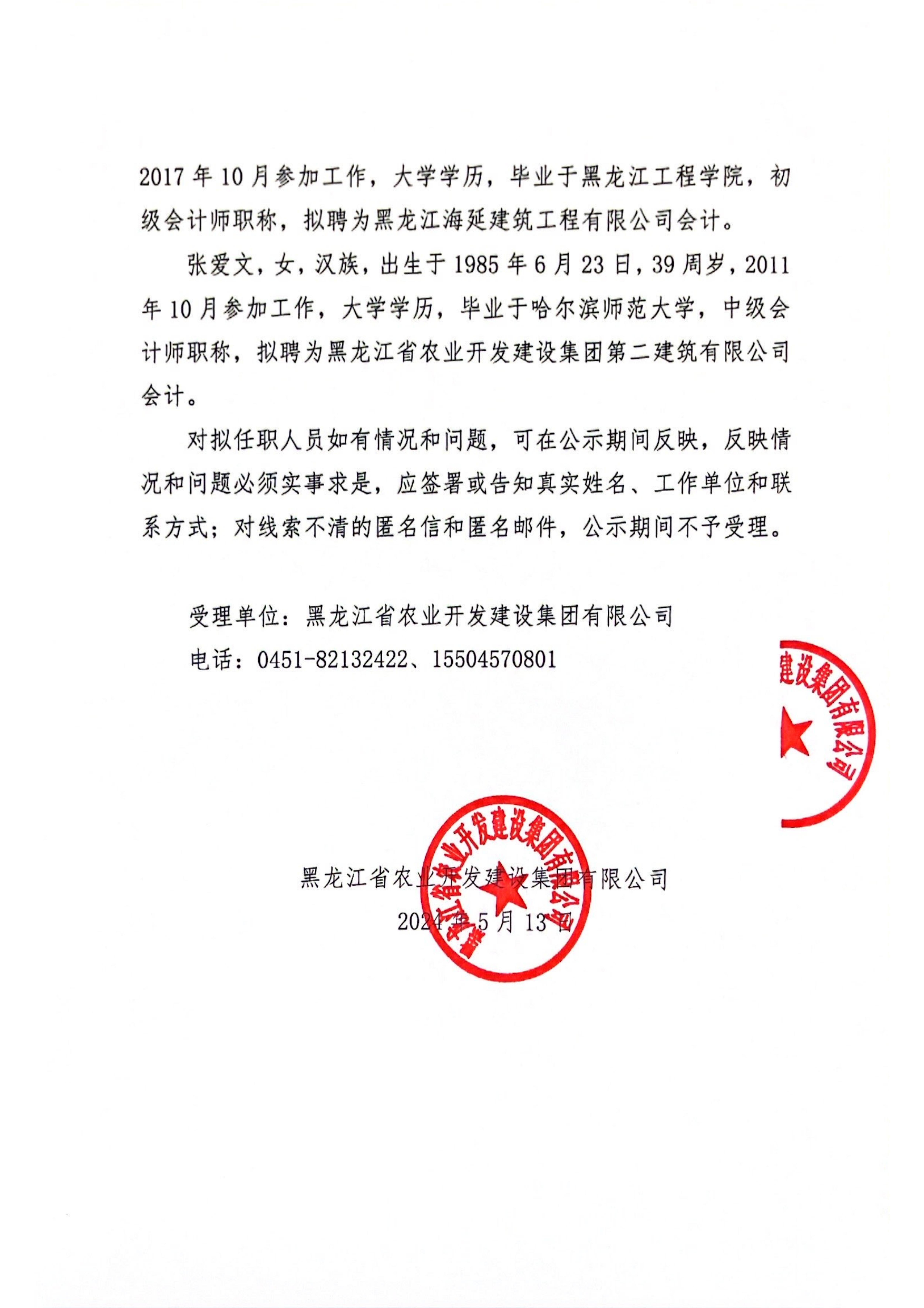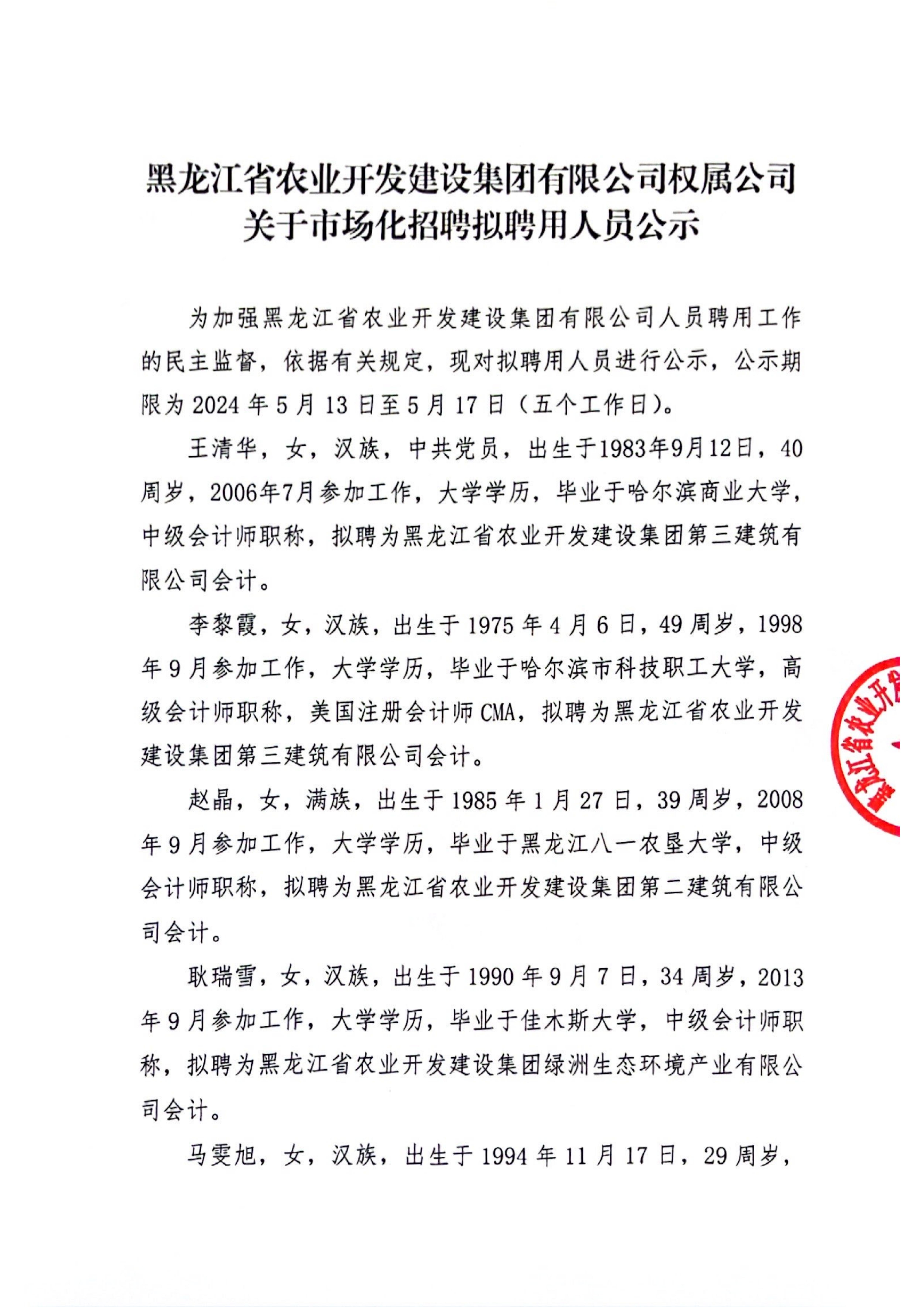黑龙江省农业开发建设集团有限公司权属公司关于市场化招聘拟聘用人员公示
