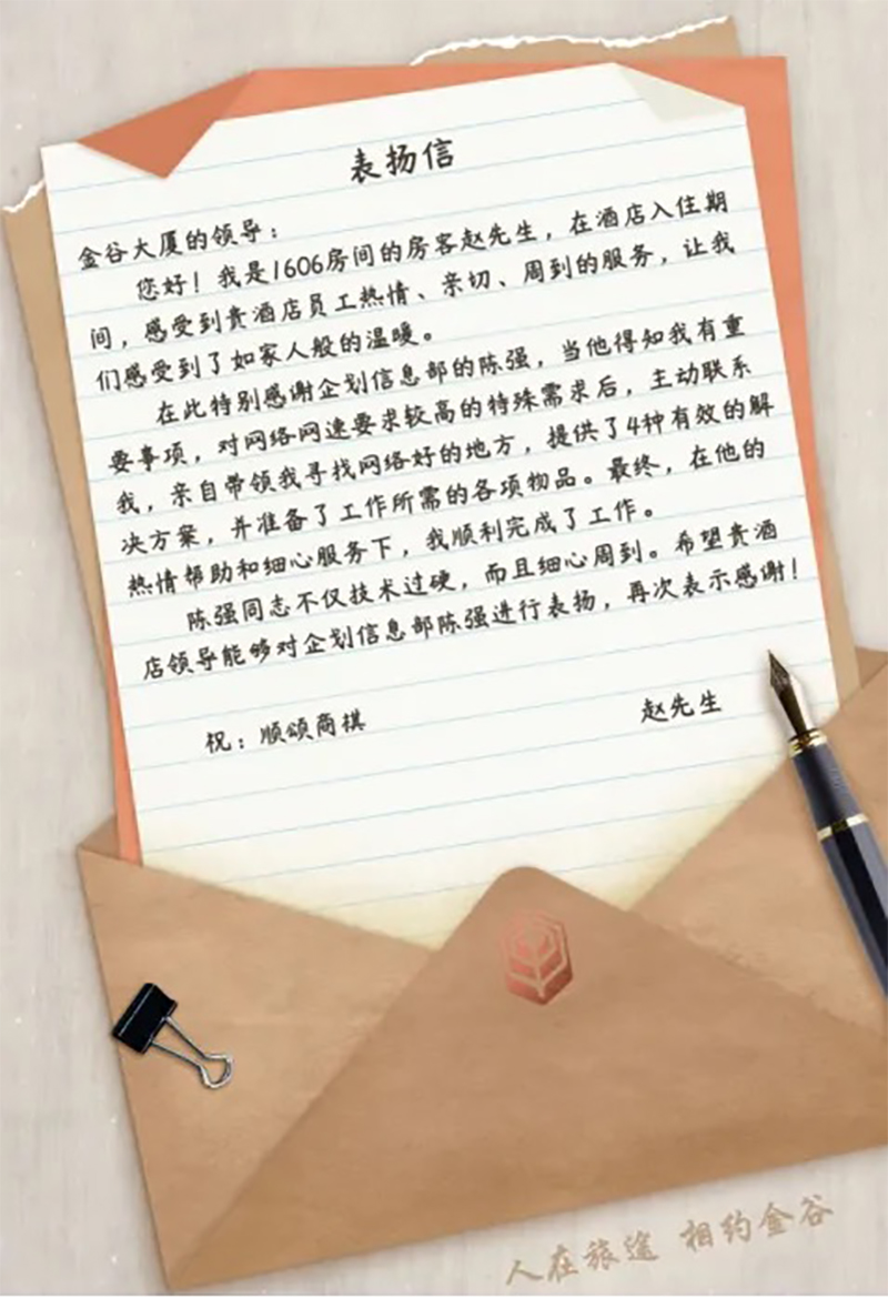 9月27日赵先生及同伴两人入住金谷大厦,因有重要工作事项需要处理,对网速有较高要求,客人通过服务中心联系到陈强,陈强得知客人需求后,为客人提供了4种有效的解决方案,不断进行测试、调整,确保网络的速度和稳定性,并贴心地为客人准备了工作所需的各项物品。在他热情帮助和细心服务下,客人顺利完成了工作,获得领导的表扬,客人也对陈强的工作能力及服务态度给予了充分肯定。