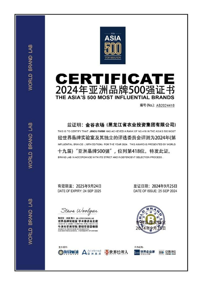 9月25日,由世界品牌实验室(World Brand Lab)主办的2024年“亚洲品牌大会”在香港举行,会上发布了2024年《亚洲品牌500强》排行榜。九州网页版-九州(中国)有限公司(以下简称“农投集团”)“金谷农场”品牌再次荣登《亚洲品牌500强》排行榜第418位,较2023年的436位,提升了18位,再一次提升了“金谷农场”的品牌影响力和企业的核心竞争力,这一卓越成就为黑龙江省的农业品牌发展也增添了浓墨重彩的一笔。