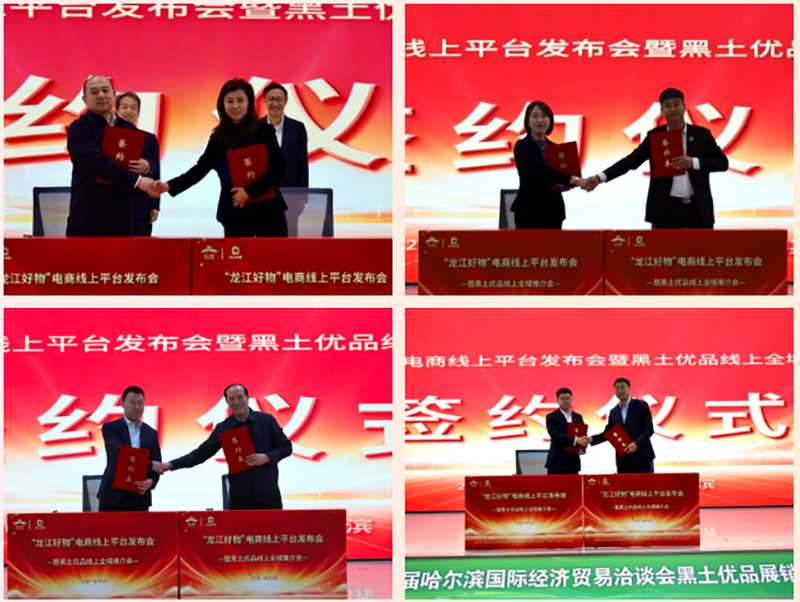 推介会上,“龙江好物”电商线上平台、哈尔滨银行、上海吉贡企业管理有限公司分别进行了产品发布和推介。省农投集团与哈尔滨银行、农投食品公司与智谷云农业科技院、哈尔滨银行绥化分行与农垦龙王食品有限公司、哈尔滨银行哈尔滨分行与鲜玉良田公司、农投食品公司与上海吉贡公司分别签订了合作协议。省妇联向省农投集团授予“巾帼直播选品基地”称号。