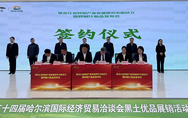 △省国资委党委书记、主任王凤文致辞 △鹤岗市人民政府副市长张剑致辞 △省农投集团党委副书记、副董事长、总经理 杨世志致辞 王凤文在致辞中表示,农投集团要深入贯彻落实习近平生态文明思想,依托黑龙江省丰富白桦资源禀赋,聚焦白桦树汁全产业链开发,推动生态优势向经济优势转化,打造具有核心竞争力的高端产品矩阵,为区域绿色经济发展提供新引擎。 哈尔滨工业大学化工与化学学院特种食药与生物化工创新研究中心主任韩雪教授作《从森林滴露到黄金产业——桦树资源全链开发与高值化技术赋能东北振兴》主题演讲,系统阐述桦树资源高值化开发技术路径。 农投食品集团副总经理朱芳冰正式发布桦树汁系列新产品。 中国农科院农产品加工研究所特聘研究员杨智发布《农投食品集团桦树汁产品标准(征求意见稿)》,为产业标准化发展提供重要支撑。 省国资委、省工信厅、省教育厅、省农业农村厅、省林草局、省农业投资集团等领导共同为“黑龙江省桦树产业发展研究中心”揭牌。揭牌仪式后,农投集团与鹤岗市人民政府签署战略合作协议,农投食品集团分别与黑龙江省雨晓生物科技公司、杭州采鲜冠食品开发有限公司签订合作协议。 本次发布会的成功举办,搭建了政产学研深度融合平台,为桦树产业生态价值转化提供了新路径、注入了新动能。下一步,省农投集团将以研究中心为载体,强化科技创新引领,加速全产业链布局,推动桦树产业高质量发展,为筑牢生态安全屏障、助力东北全面振兴全方位振兴作出新贡献。