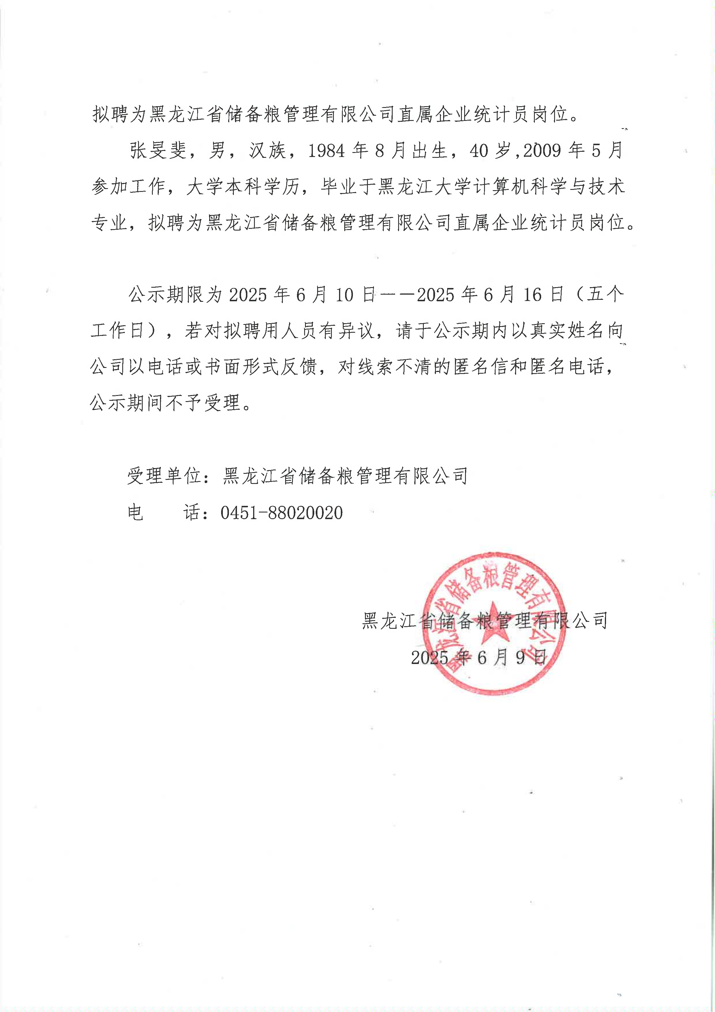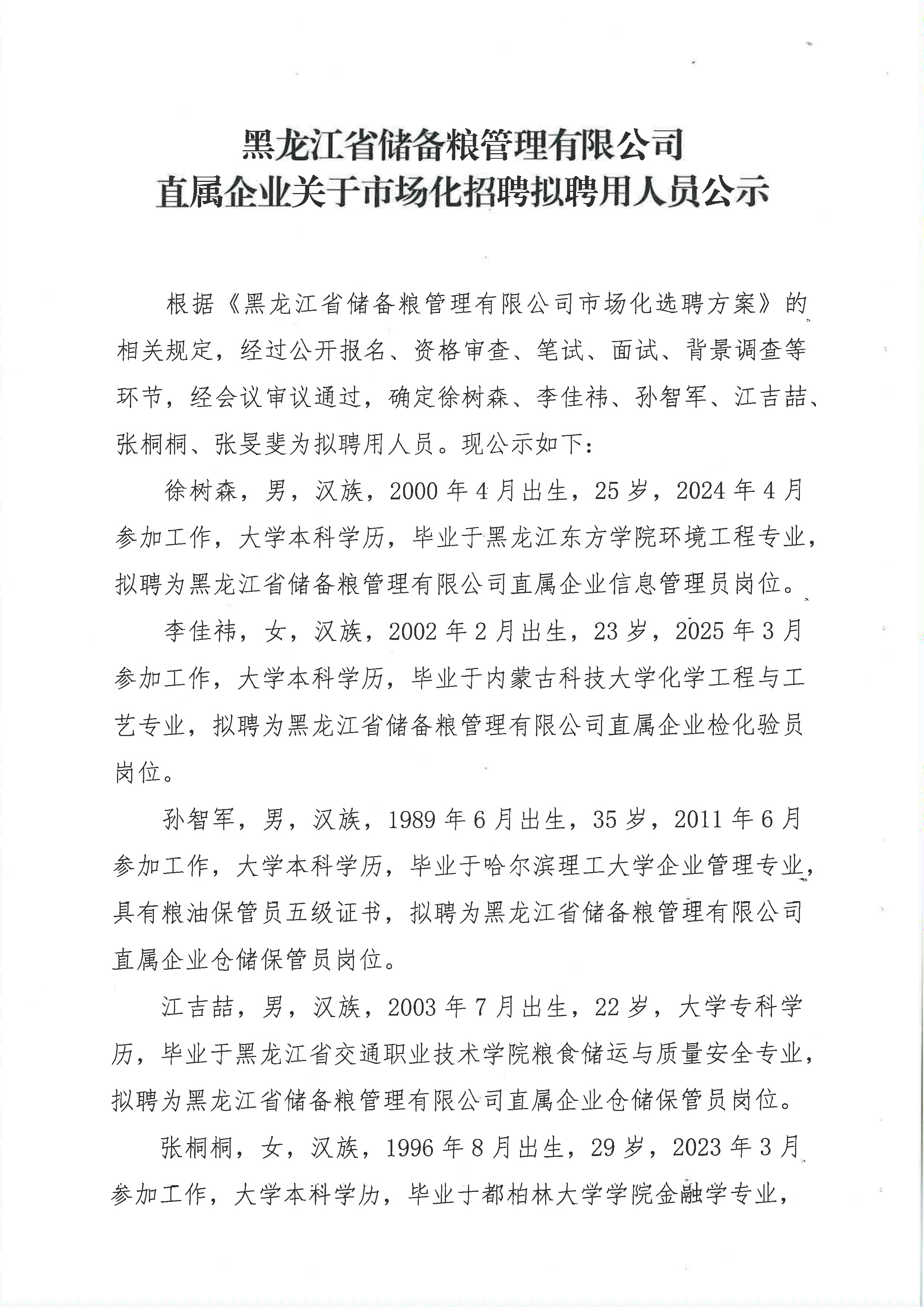 黑龙江省储备粮管理有限公司直属企业关于市场化招聘拟聘用人员公示